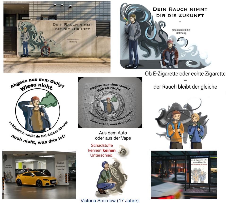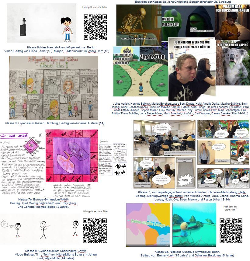 Deshalb suchten wir kreative Beiträge von Schülerinnen und Schülern, die sich mit den schädlichen Folgen des Vapings, der Nutzung von E-Zigaretten und Shishas sowie Strategien zur Vermeidung des Einstiegs und Alternativen zur Nutzung dieser Produkte beschäftigen.
